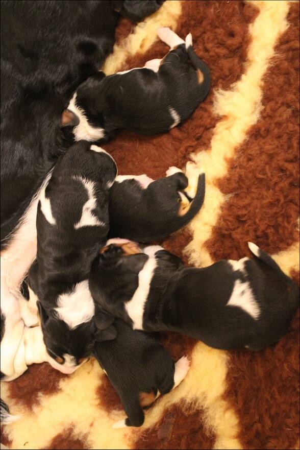 Al 2 dagen was Molly onrustig en dan weer heel kalm. Vannacht tegen half 3 weer aan de tippel en meerdere malen wilde ze naar buiten. Fijn contact met de dierenarts gehad want de onrust sloeg toch even toe bij ons beiden nadat Lisanne Matton die ons fantastisch geholpen heeft binnenkwam ving Alice gelijk de eerste pup op .Daarna ging het gewoon zeer rap. In ca 2.5 uur was Molly bevallen van 8 prachtige puppy's. We zijn zoals ik al schreef meer dan trots op haar. Pakt gelijk alles goed op. Nu nagenieten van een droom die werkelijkheid werd.