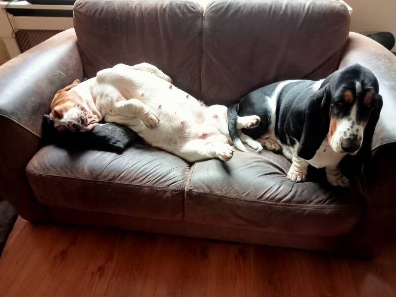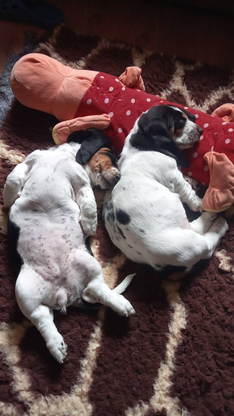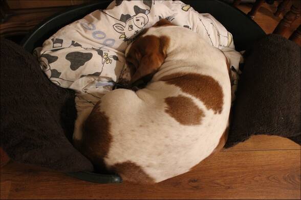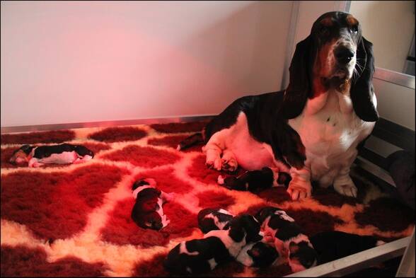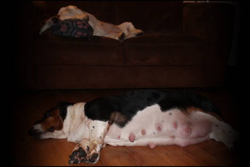 Nou de laatste dan van vandaag......Ze zijn echt niet alleen maar aan het slapen hoor onze Bassen.....maar Betsy die we zo nu en dan ADHD Basset noemen is normaal amper op de foto te zetten....zit nooit stil ;-) Flauw ik weet het....Molly is duidelijk zwanger volgens mij.Kan hier uren naar kijken.Op naar dag 58!!!!!